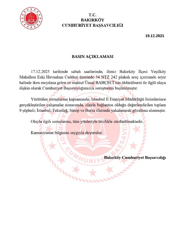 Konuya ilişkin Bakırköy Cumhuriyet Başsavcılığından yapılan açıklamada, “17.12.2025 tarihinde sabah saatlerinde, ilimiz Bakırköy İlçesi Yeşilköy Mahallesi Eski Havaalanı Caddesi üzerinde 34 NTZ 242 plakalı araç içerisinde seyir halinde iken meydana gelen ve maktul Ünsal BAHÇECİ’nin öldürülmesi ile ilgili olaya ilişkin olarak Cumhuriyet Başsavcılığımızca soruşturma başlatılmıştır.