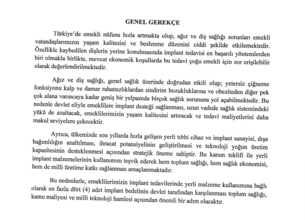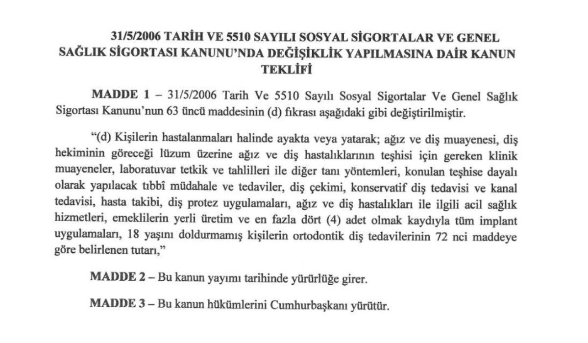 TBMM'ye sunulan kanun teklifi ile implant tedavisinde yerli üretim ve 4 adedi geçmemek şartı ile ücretin Sosyal Sigortalar Kurumu tarafından karşılanması önerildi.