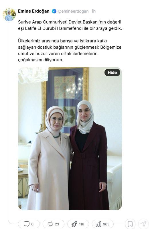 NSosyal platformu üzerinden açıklamalarda bulunan Cumhurbaşkanı Recep Tayyip Erdoğan'ın eşi Emine Erdoğan, Suriye Cumhurbaşkanı Ahmed Şara'nın eşi Latife El Durubi ile bir araya geldiğini duyurdu.