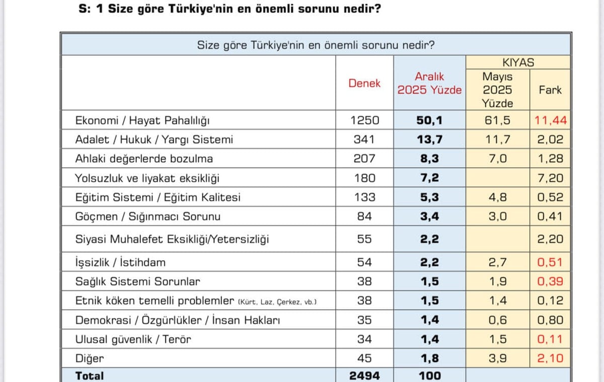 Ekonomi başlığı ilk sıradaki yerini korusa da, Mayıs 2025’e kıyasla 11,4 puanlık bir düşüş yaşandı. Bu gerileme, ekonomik sorunların hafiflemesinden çok; adalet, hukuk ve kurumsal işleyişe dair rahatsızlıkların daha görünür hâle geldiğini gösteriyor.