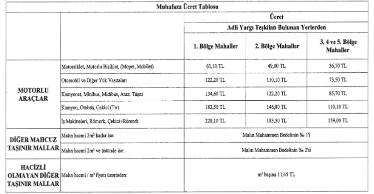 Buna göre, lisanslı yediemin depolarında muhafaza edilen mahcuz malların muhafaza ücreti ile çilingir, çekici ve nakliye hizmetlerine ilişkin bedeller ücret tablosu esas alınarak hesaplanacak. Lisanslı yediemin deposu bulunmayan yerlerde ise muhafaza ücretleri, tabloda yer alan bedellerin yüzde 80’i üzerinden belirlenecek.