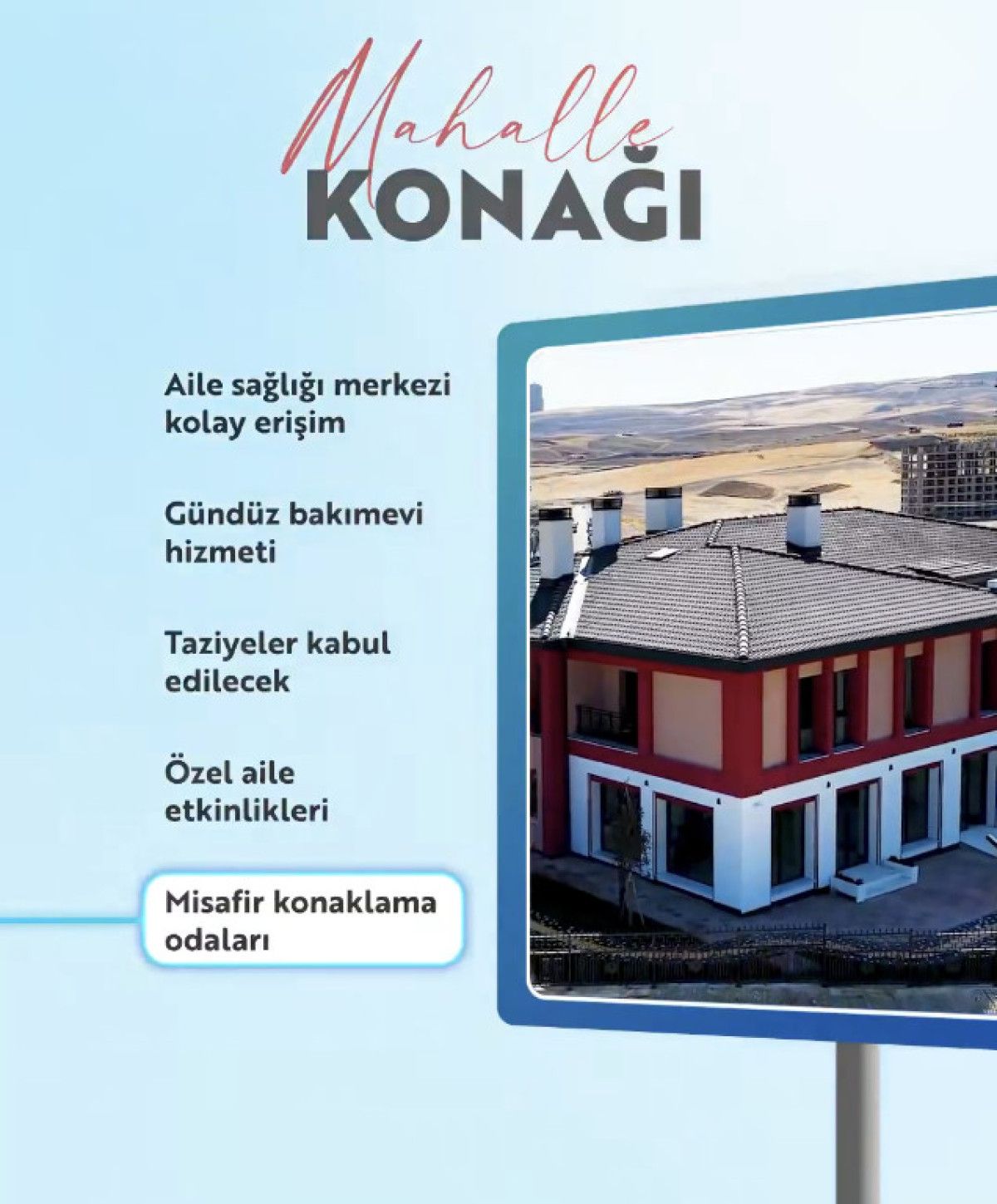 Mahalle konaklarında taziye evi, yaşlılar etkinlik alanı, kafeterya, aile sağlığı merkezi, anaokulu, el sanatları üretim merkezi, spor salonu ve misafirhane bulunacağı belirtildi.