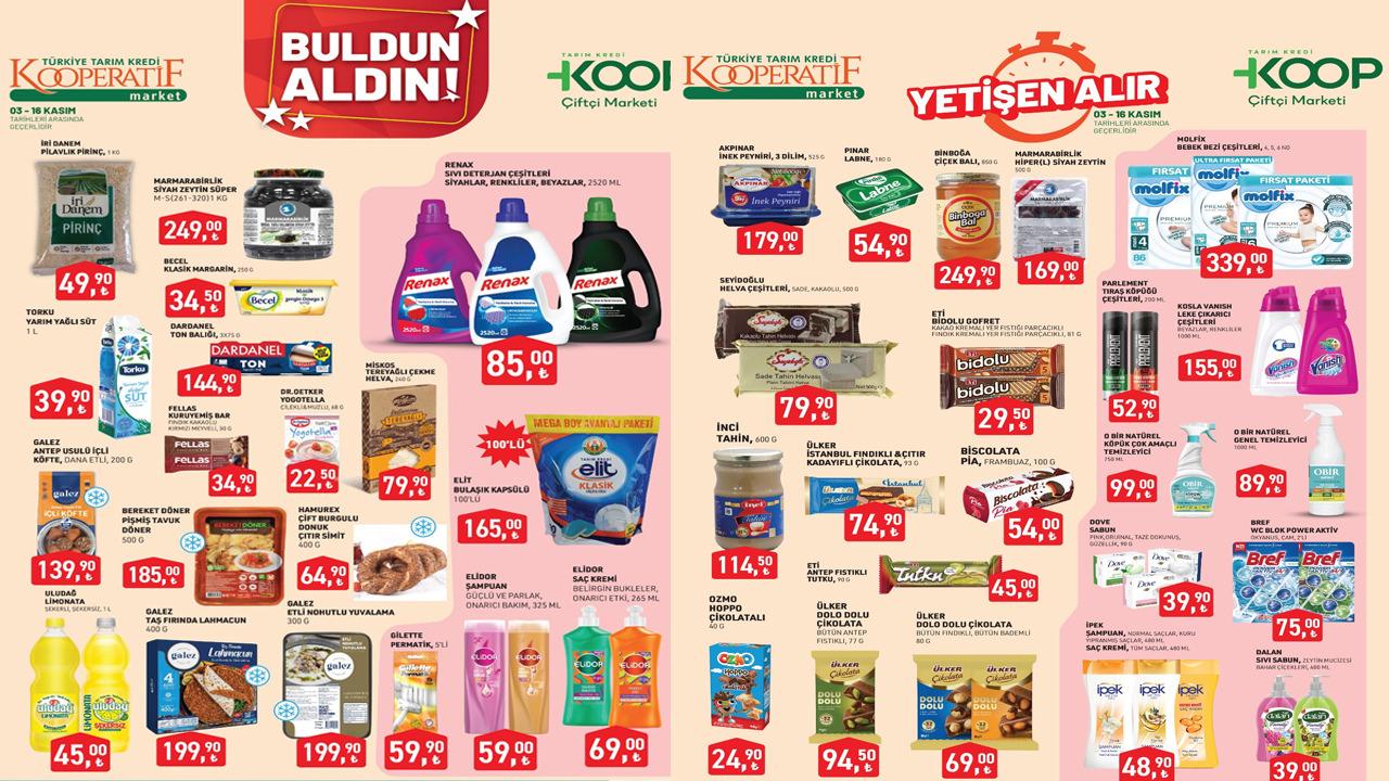 Tarım Kredi Market'te 16 Kasım tarihine kadar; pilavlık pirinç, sıvı deterjan çeşitleri, bulaşık kapsülü, pişmiş tavuk döner, tereyağlı çekme helva, antep usülü içli köfte, çift burgulu donuk çıtır simit, etli nohutlu yuvalama ve taş fırında lahmacun cazip fiyatlarla raflarda yer alacak.